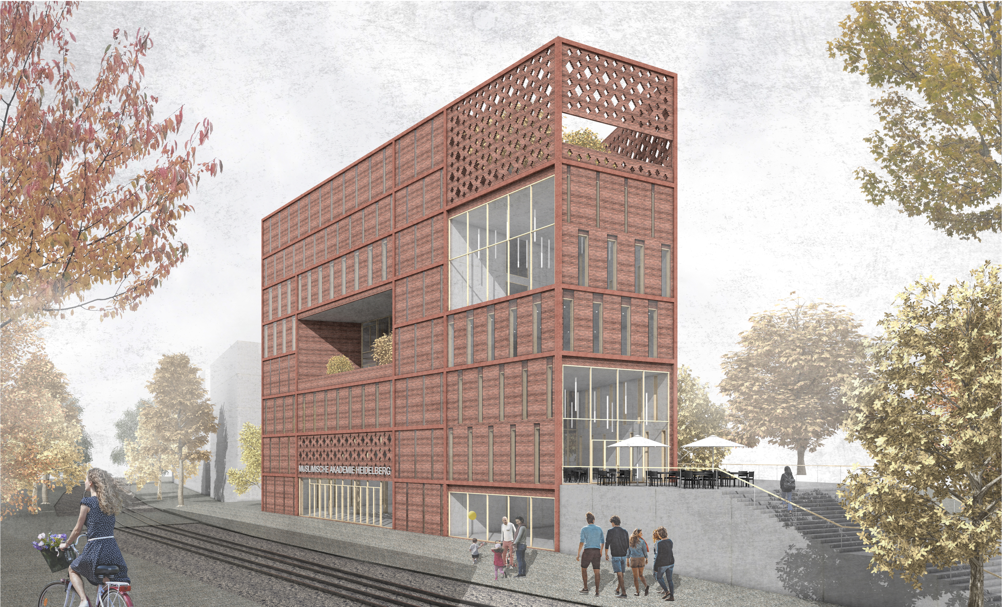 MGF Architekten (Stuttgart) mit Wiedmann + Schweizer Landschaftsarchitektur (Stuttgart) entwerfen die Muslimische Akademie Heidelberg aus Recyclingbeton und einer Fassade aus Recyclingziegeln. Das Muster der Backsteinfassade erinnert an Teppiche mit verwebten und gegliederten Flächen. Der begrünte und von einem Filtermauerwerk umschlossenen Dachgarten mit dem Wasserbecken und die Dachfläche dienen als Wasserspeicher des Niederschlagswassers. Die Gestaltung der Innenräume und die Blickmöglichkeiten und Öffnungen nach Außen überzeugten die Jury, die Eingangssituationen und Bezüge in die Marga-Faulstich-Straße bewertete das Gremium jedoch als weniger vielversprechend.