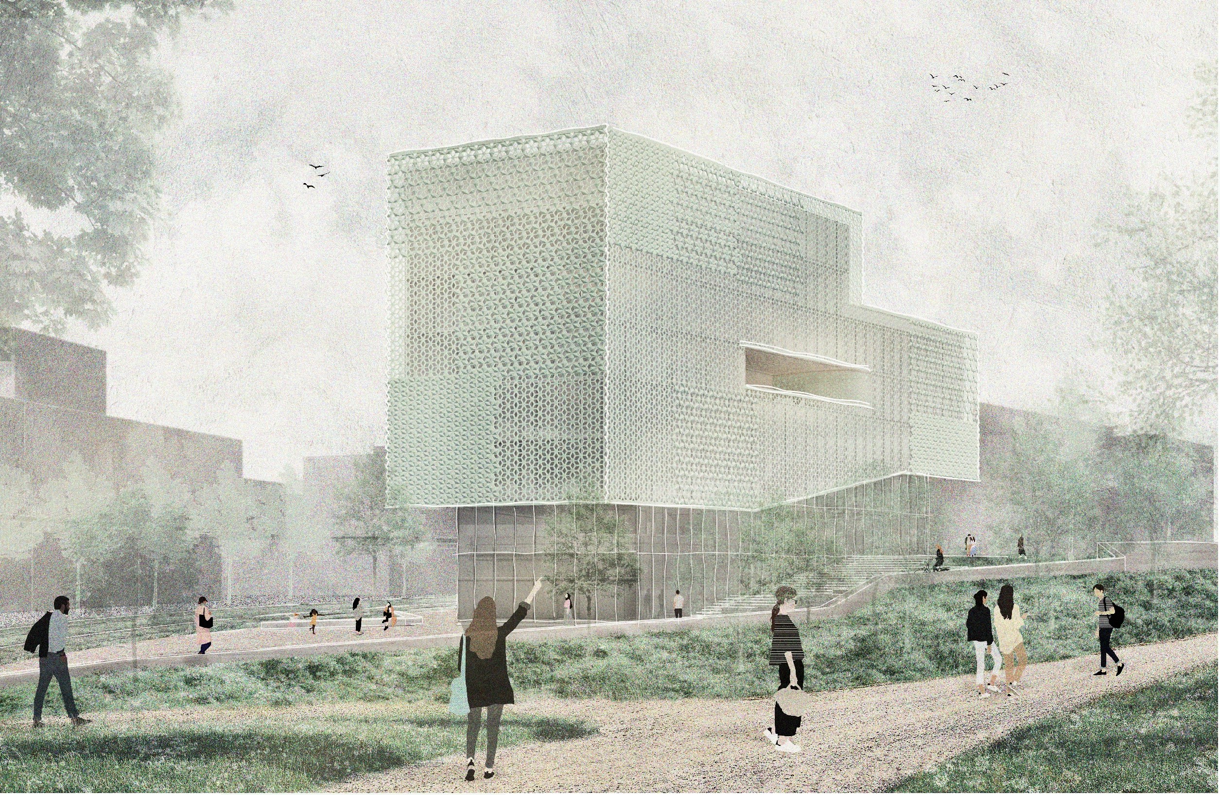 Yonder Architektur und Design (Stuttgart) mit PEYKER Landschaftsarchitektur (Schönaich) schlagen für die Muslimische Akademie eine klimapositive, low-tech Holzkonstruktion mit einer auffällig gestalteten, „reliefartigen“ Fassade und üppiger Begrünung der Dach- und Terrassenflächen vor. Die collageartig zusammengefügten Fassadenelemente bestehen aus Photovoltaik-Modulen in unterschiedlichen Größen und stellen eine subtile Interpretation muslimischer Ornamentik dar. Die Dachterrassen sind in diesem Entwurf als halböffentliche Freiräume vorgesehen, die zur Teilhabe am gemeinschaftlichen Leben einladen. Die Jury lobte den Entwurf insbesondere für seine Freiraumgestaltung und die interessanten Übergänge des Gebäudes von Außen nach Innen.