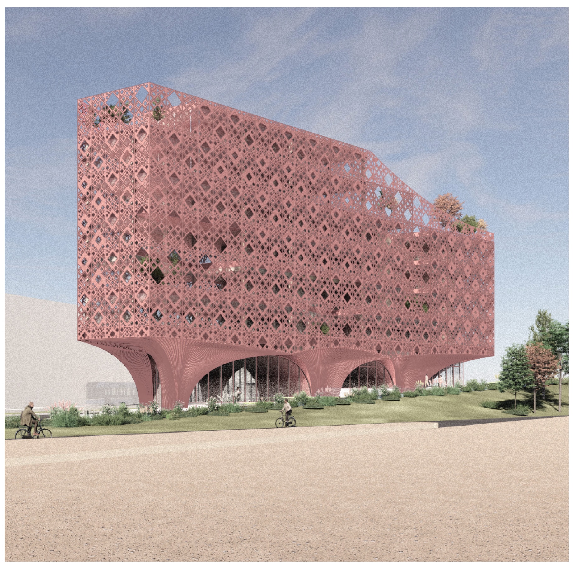 ACME (Berlin/ London) mit SPACEHUB Landschaftsarchitekten (London) sehen ein Gebäude mit Holztragwerk vor, das durch einen öffentlich zugänglichen Sockelbereich mit Holz verkleideten Bögen die Verwurzelung der Muslimischen Akademie in Heidelberg zum Ausdruck bringen soll. Die Jury lobte die Fassade, die in diesem Entwurf aus perforiertem Metall mit geometrisch konstruierten Mustern besteht, das die feine Handwerklichkeit islamischer Architektur aufnimmt. Die Jury hob die zahlreichen nutzbaren Innenhöfe und loggienartigen Einschnitte als positiv für die Nutzer*innen hervor; aus energetischer Gesichtspunkten wurde dies allerdings kritisch bewertet.